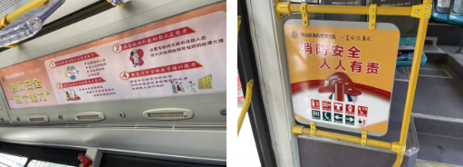 此外,還利用車內(nèi)燈箱、座位靠背、扶手、車門擋板等處宣傳消防公益廣告,內(nèi)容包括消防安全“四個(gè)能力”、公交車消防安全設(shè)施使用講解、火場(chǎng)逃生基本法則、火災(zāi)逃生要點(diǎn)等消防知識(shí),確保乘客有針對(duì)性地學(xué)習(xí)和了解消防安全。