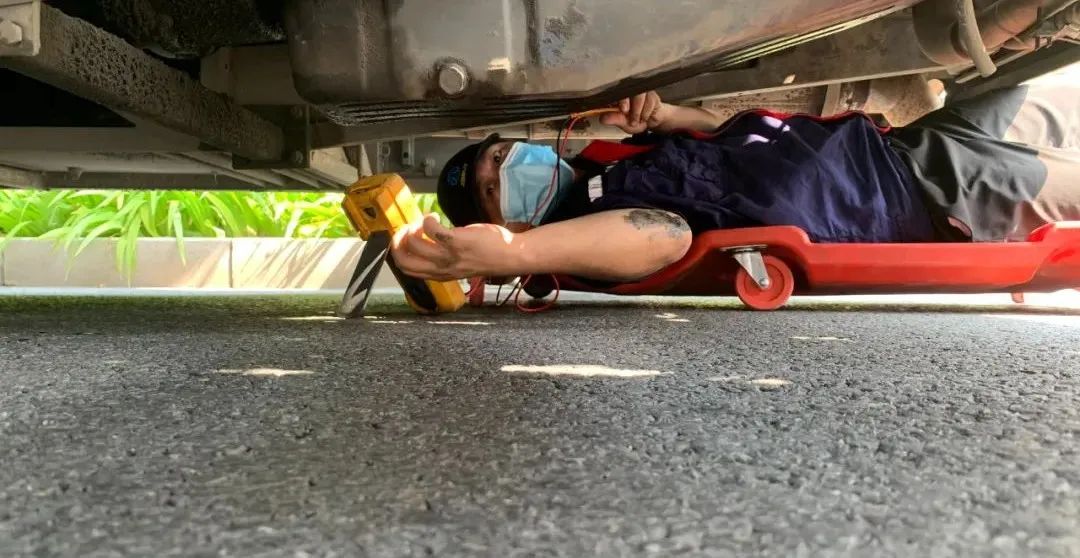 在分公司修理車間,停放著數(shù)輛等待維修的公交車,修理人員們正在對車輛進行檢修,“熱火朝天”地工作著:有的頭頂烈日,蹲坐在公交車頂維修空調(diào);有的貓著腰鉆到狹窄悶熱的地溝里,頂著發(fā)燙的機器揮動扳手;有的躺進蒸籠似的公交車底,認真檢查修理車輛故障......豆大的汗珠從他們的臉上不住地往下滴,衣服從來都是濕的,皮膚上到處都是油漬。“雖然很熱、也很辛苦,但想想這車經(jīng)過自己的雙手維修后又能安全上路,一切都是值得的。”修理工孫師傅說道。