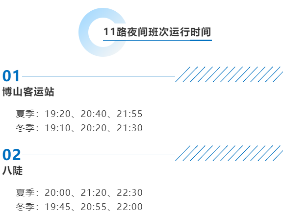11路公交車途經世紀廣場、火車站、百貨大樓、省陶瓷公司、陶琉大觀園等24個站點,串聯了博山區(qū)商業(yè)、旅游、住宅及教育文化多個區(qū)域,將搭載市民全方位感受“夜博山”的精彩與繁華。夏季博山客運站末班發(fā)車時間21:55、八陡站22:30,冬季博山客運站末班發(fā)車時間21:30、八陡站22:00,共3個發(fā)班次。