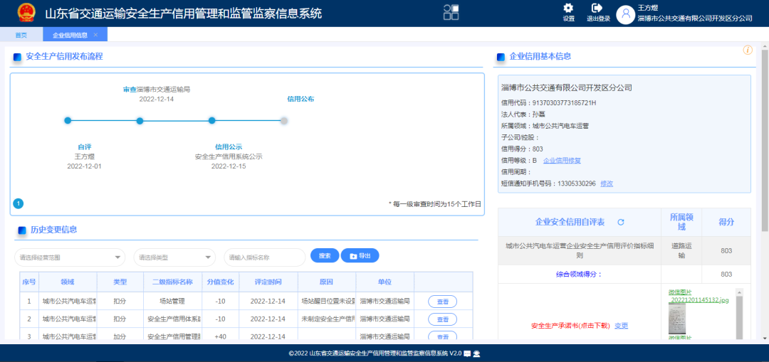 為全面落實安全生產主體責任,促進開發(fā)區(qū)分公司安全生產信用體系建設,2022年12月,分公司安??圃谏綎|省安全生產信用管理平臺填報相關材料,對照城市公共汽電車運營企業(yè)安全生產信用評價指標細則認真梳理各項內容要求,完成了材料上傳和自評工作。12月14日前,上級主管部門對分公司進行了安全生產信用審查評定。