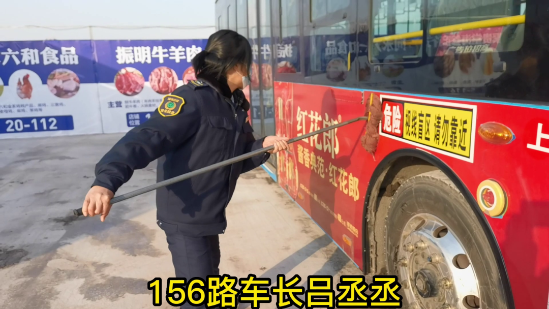 大年初一,正是呂丞丞值班的日子。剛跑完一趟156路車,來(lái)到位于海月龍宮的公交站點(diǎn),呂丞丞趕緊拿起拖把、水桶,打算把車體和車廂清掃一遍。由于天氣比較冷,車?yán)锏耐习褍龀梢慧?,為了?jié)省時(shí)間,在規(guī)定的15分鐘內(nèi)完成清潔,呂丞丞趕緊跑到值班室換了一個(gè)拖把。呂丞丞:“發(fā)車之前,先圍著車轉(zhuǎn)一圈,看看有沒有剮蹭,車體臟不臟,再到值班室填寫簽到表”。