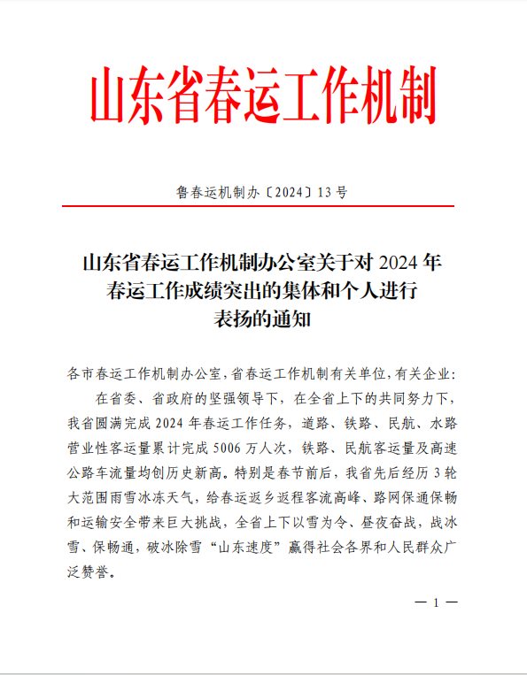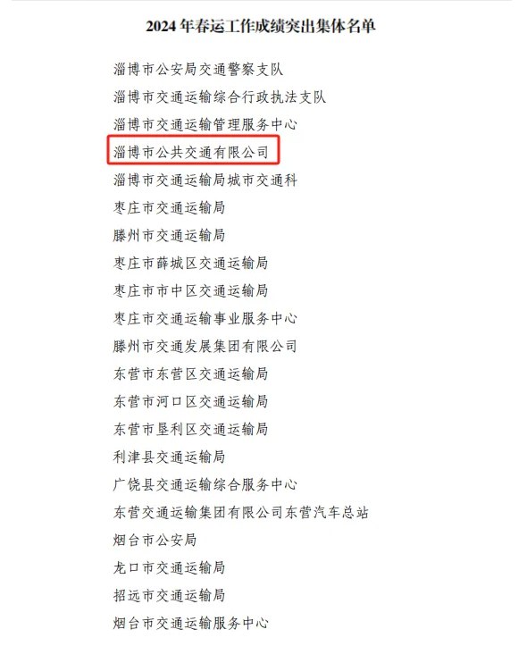 近日,山東省春運(yùn)工作機(jī)制辦公室印發(fā)《關(guān)于對(duì)2024年春運(yùn)工作成績(jī)突出的集體和個(gè)人進(jìn)行表?yè)P(yáng)的通知》,淄博市公共交通有限公司被評(píng)為“2024年春運(yùn)工作成績(jī)突出集體”。
