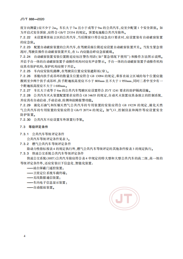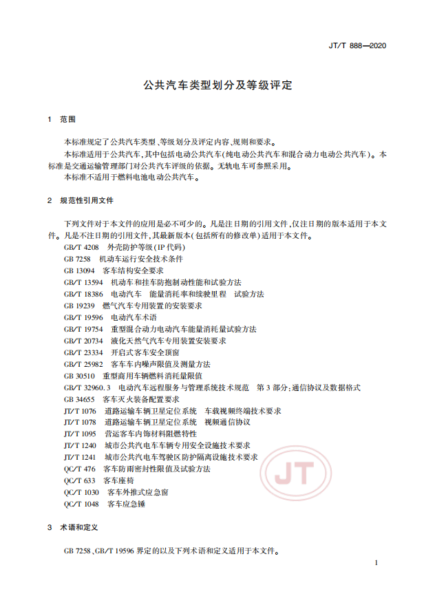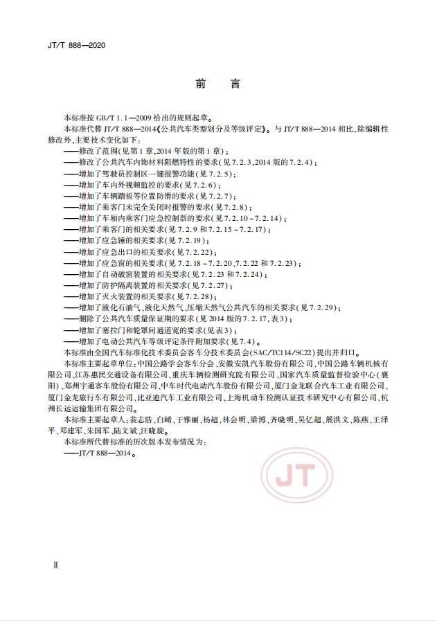 中華人民共和國交通運輸行業(yè)標準《公共汽車類型劃分及等級評定》(以下簡稱:該標準)JT/T 888—2020(代替JT/T888—2014) 于2020年4月28日發(fā)布并于2020年7月1日實施。